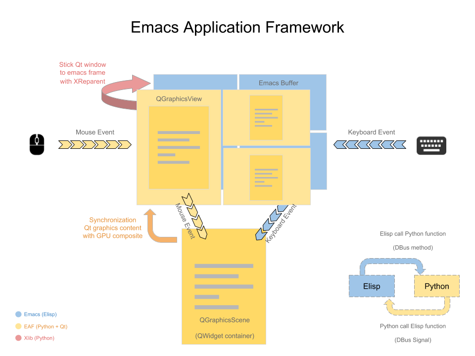 • When user use keyboard input in Emacs buffer, Emacs will key event to QGraphicsScene throught DBus IPC.